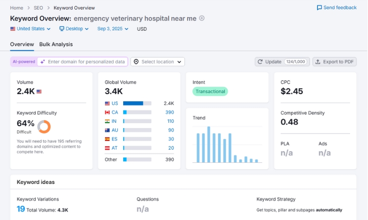 Apart from Google Suggest, you can also get relevant keywords from SEMrush. This is a great keyword research tool that can help veterinary practices select closely related keywords for their PPC campaign.